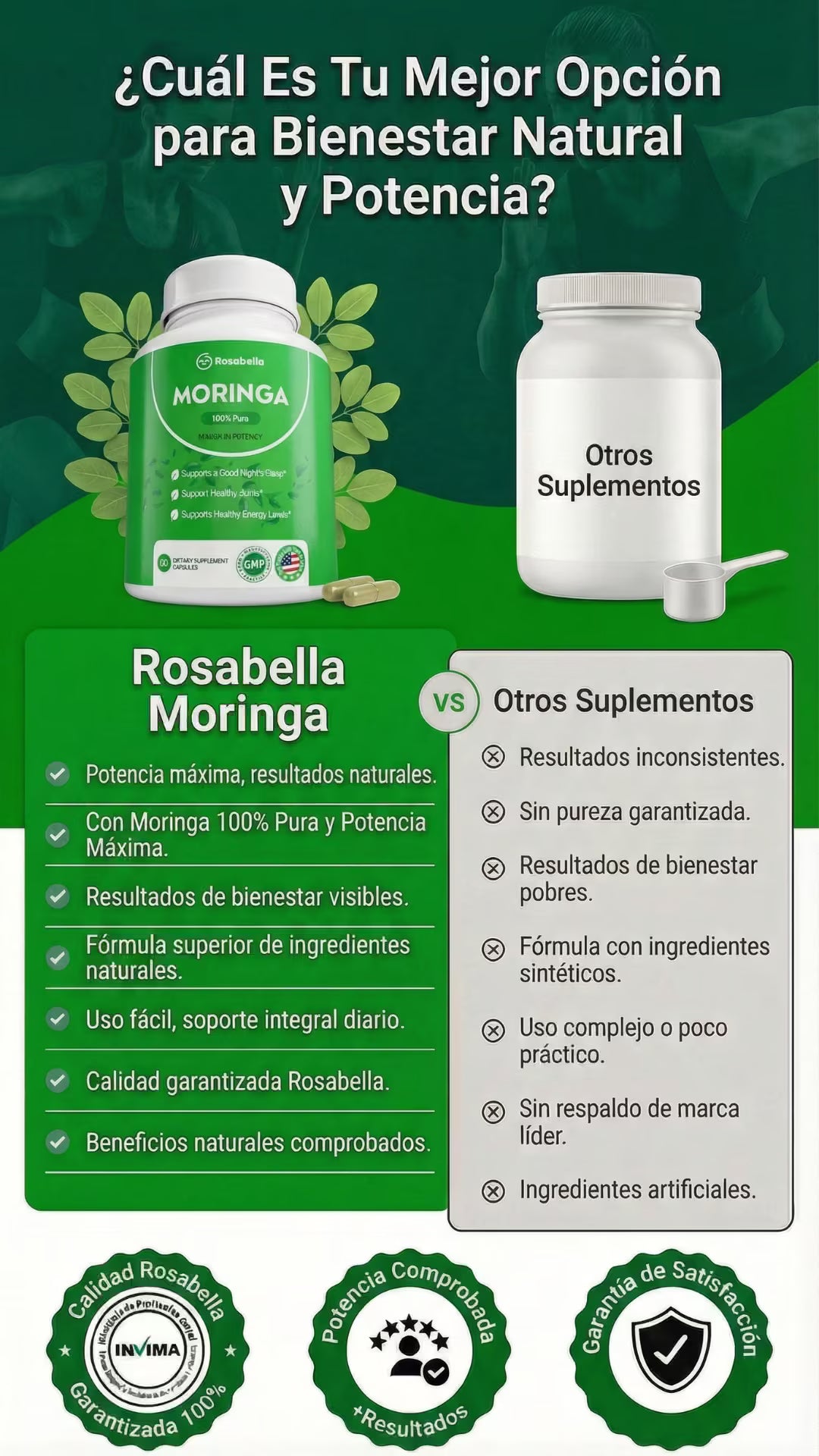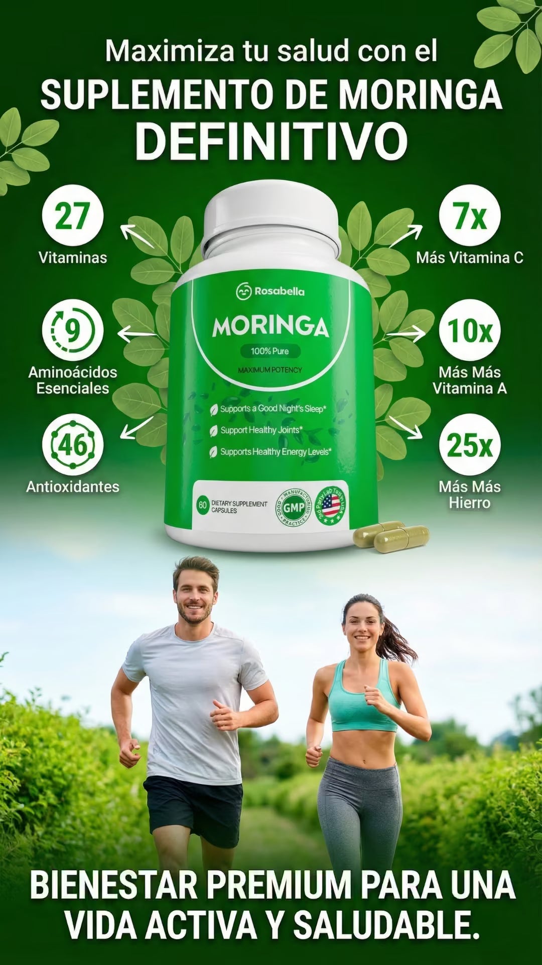 Rosabella Moringa es tu superalimento definitivo. Con 800 mg de hoja pura, ofrece energía constante sin los efectos de la cafeína, mientras nutre tu piel y mejora tu digestión. Cargado de 27 vitaminas y antioxidantes, es una fórmula vegana y limpia que fortalece articulaciones y revitaliza tu cuerpo desde dentro. Contiene 60 cápsulas, consumir 2 al día.