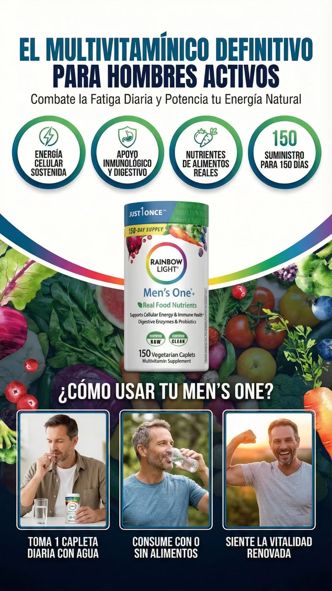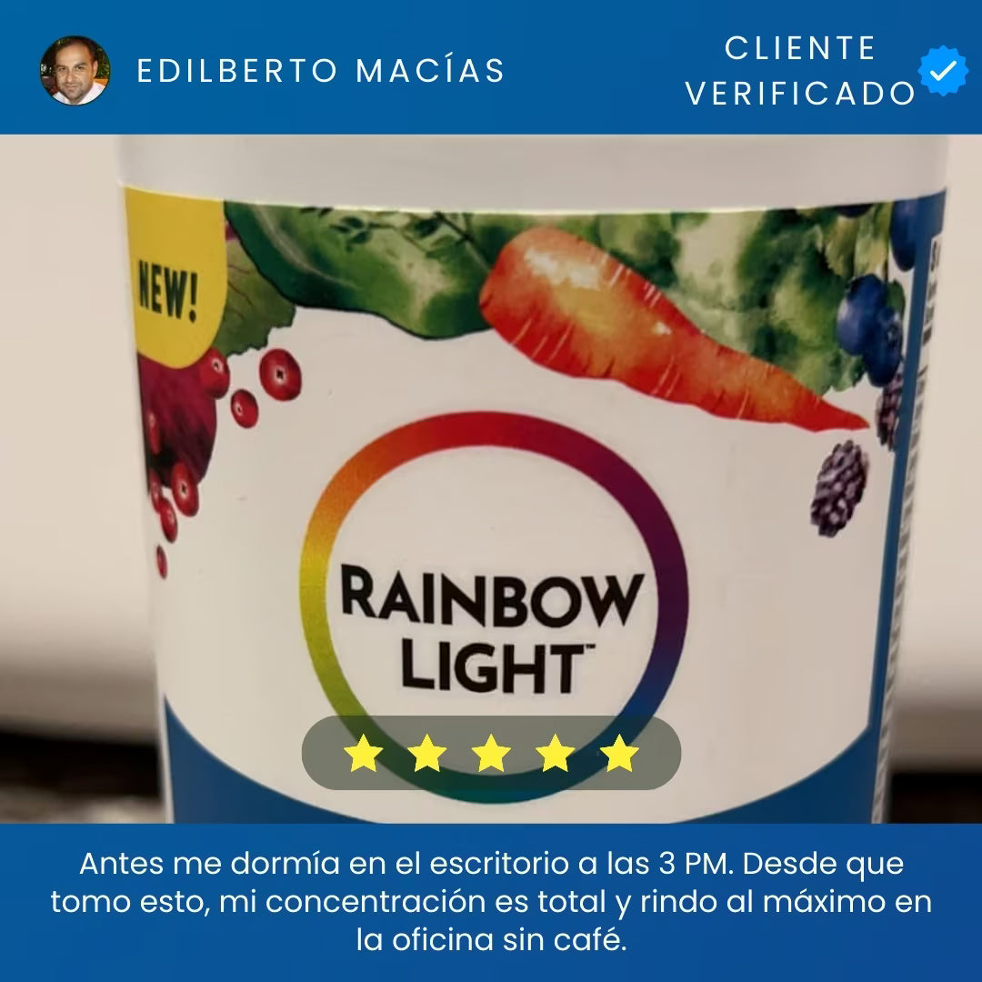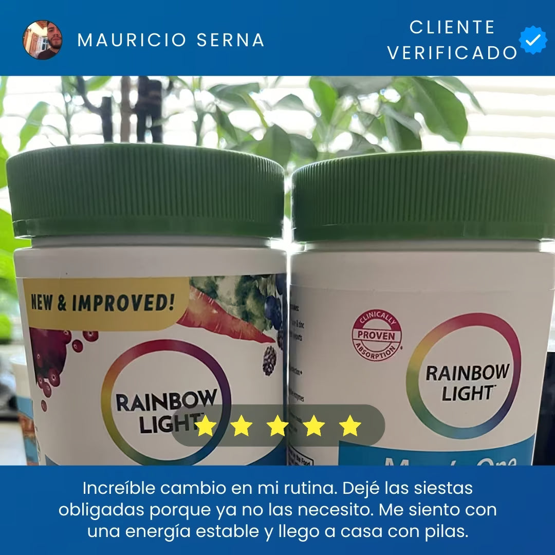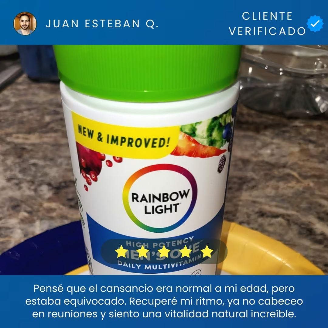 Rainbow Light Men's One es un multivitamínico premium para hombres de 40+ que buscan energía real sin cafeína. Una sola tableta diaria vegetariana potencia tu vitalidad, próstata y digestión con Saw Palmetto y probióticos. Fórmula pura 'Food-Based', libre de gluten y alérgenos, certificada para garantizar máxima absorción y rendimiento diario sostenido.