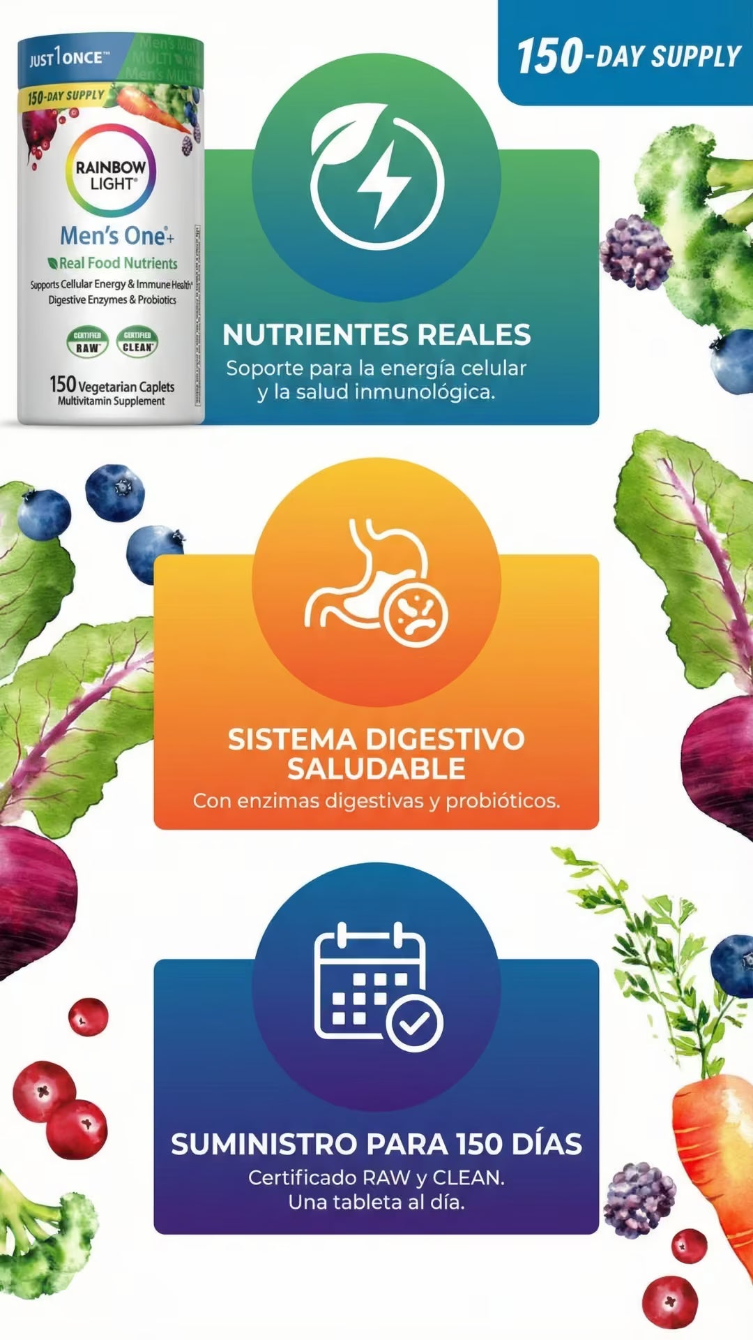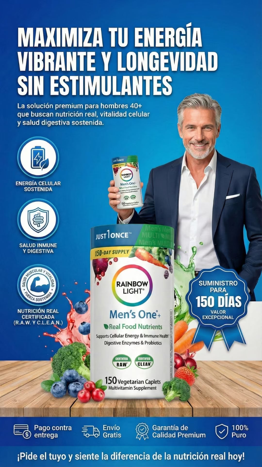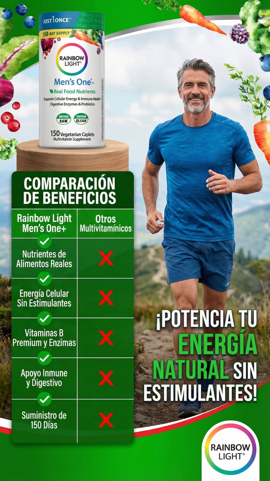 Rainbow Light Men's One es un multivitamínico premium para hombres de 40+ que buscan energía real sin cafeína. Una sola tableta diaria vegetariana potencia tu vitalidad, próstata y digestión con Saw Palmetto y probióticos. Fórmula pura 'Food-Based', libre de gluten y alérgenos, certificada para garantizar máxima absorción y rendimiento diario sostenido.